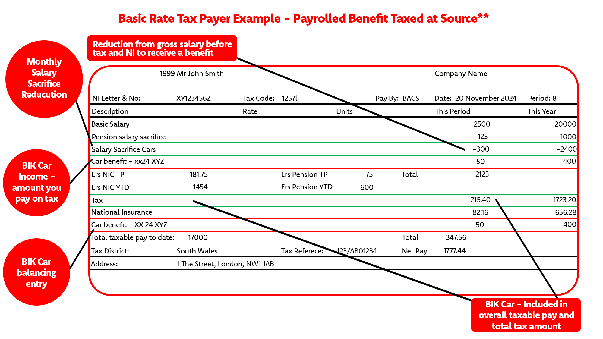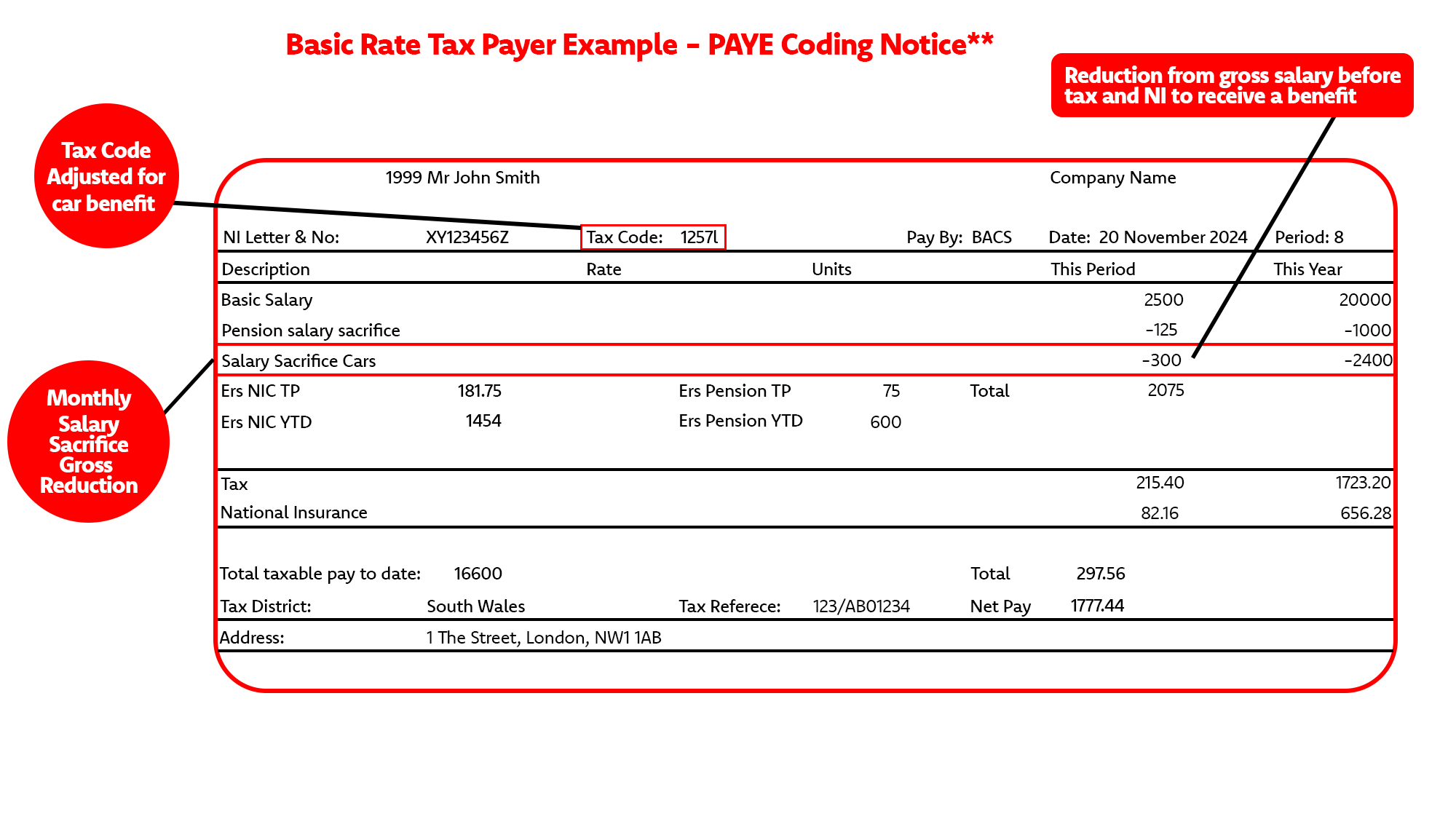 There are two ways of managing payroll for benefits. The one below shows the alternative to payrolling benefits which is to change the employee’s tax code which shows differing information to the first example shown.*